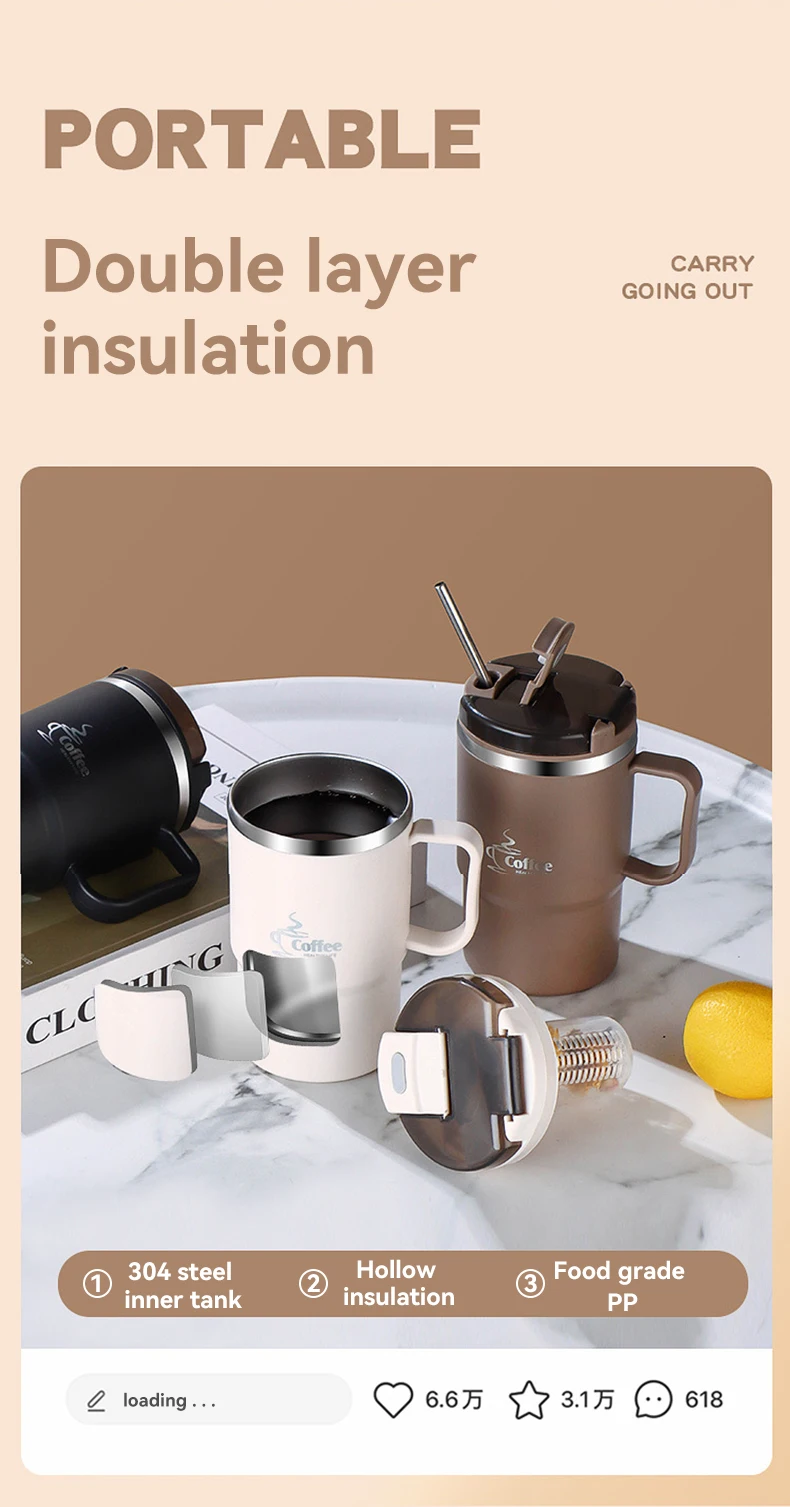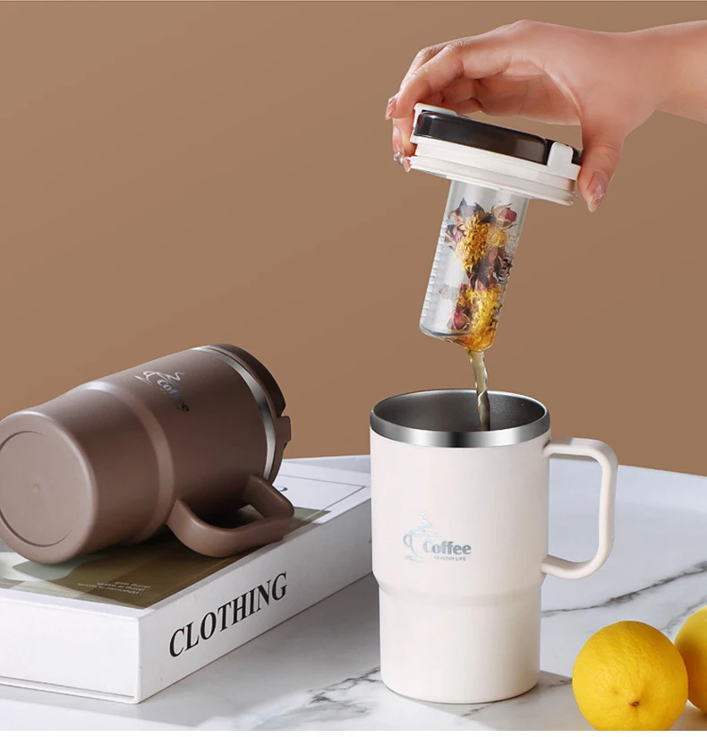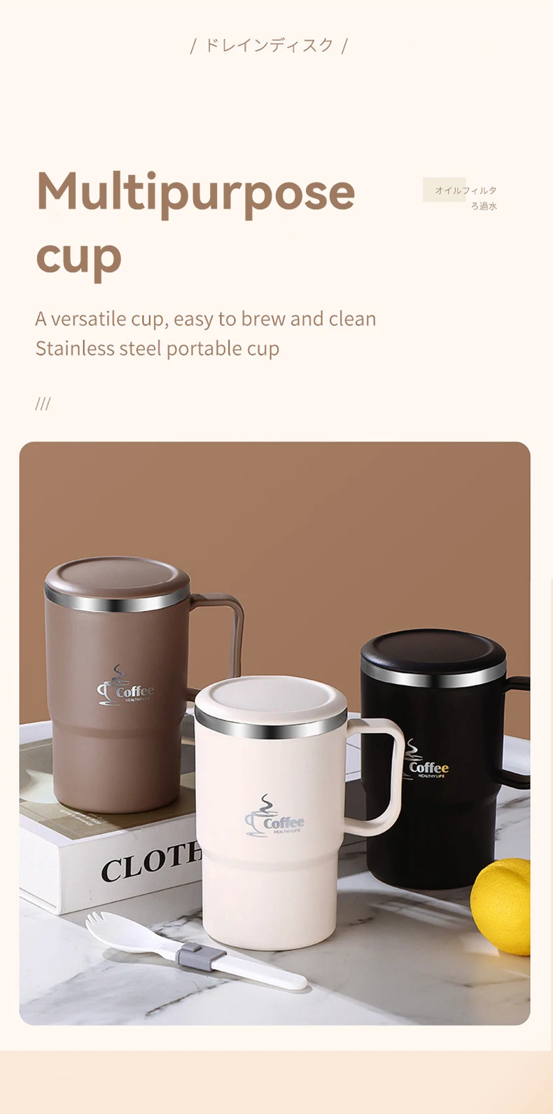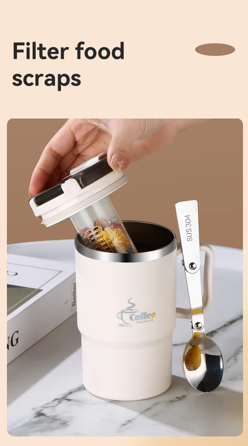 WORTHBUY Double-Wall Coffee Mug 304 Stainless Steel Water Mug Cup With Spoon&Tea Strainer Leak Proof Anti Scalding Drinking Cup